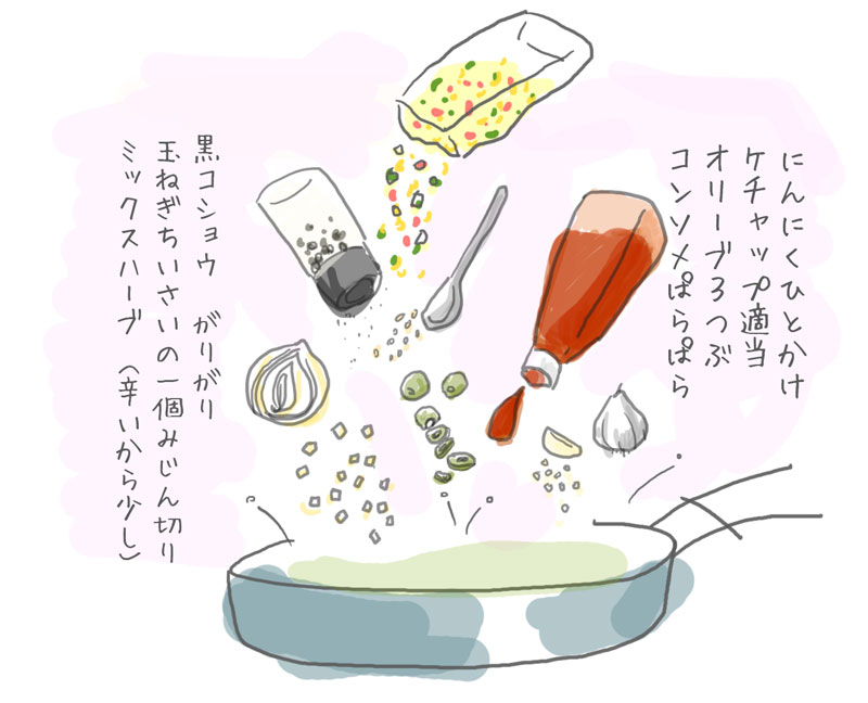 イラストに描き忘れたけれど、シメジもほうりこんで、炒める。そこにケチャップ投入。ホントならワインでも入れたいところだけど、ないので水を少々。