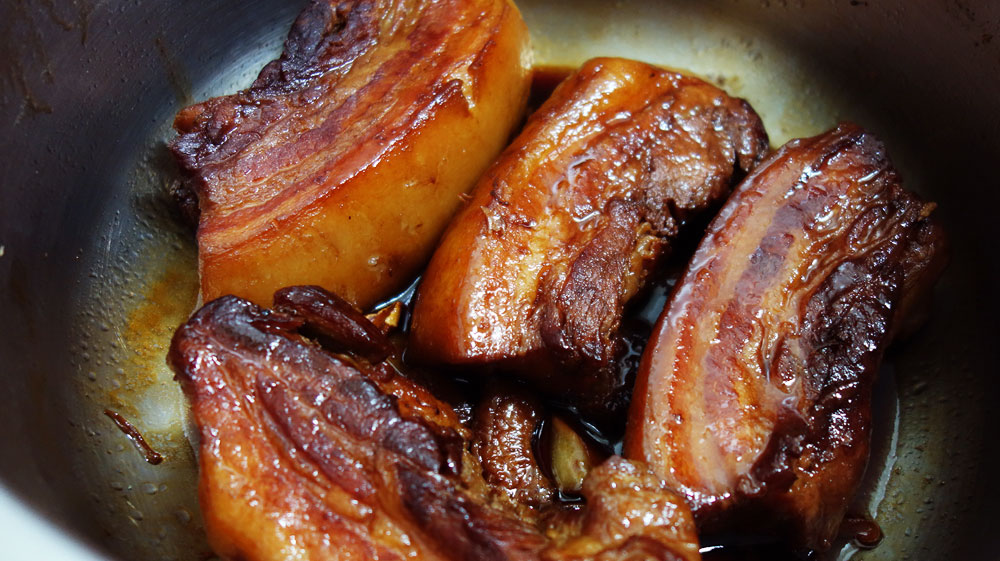醤油・砂糖・酒・ニンニク・鷹の爪で下茹でした豚バラブロックを煮る。